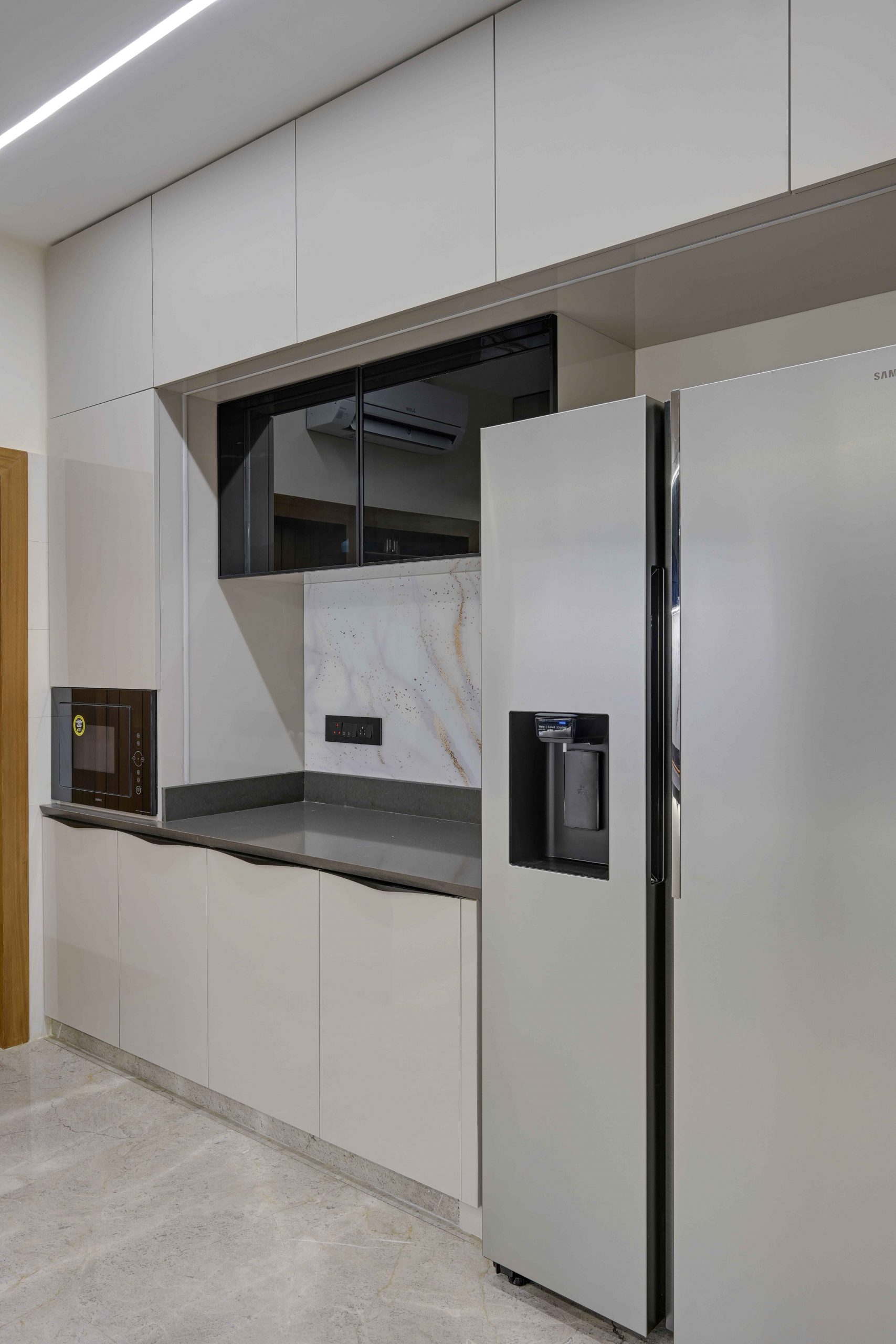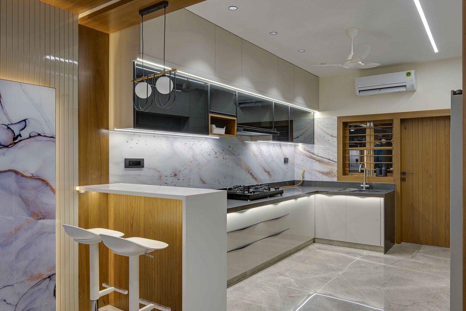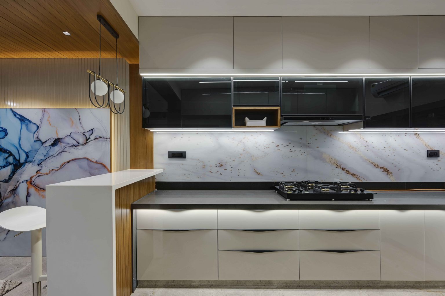 Modular kitchen setup with steel fittings, cabinets, storage units, and cooking essentials.